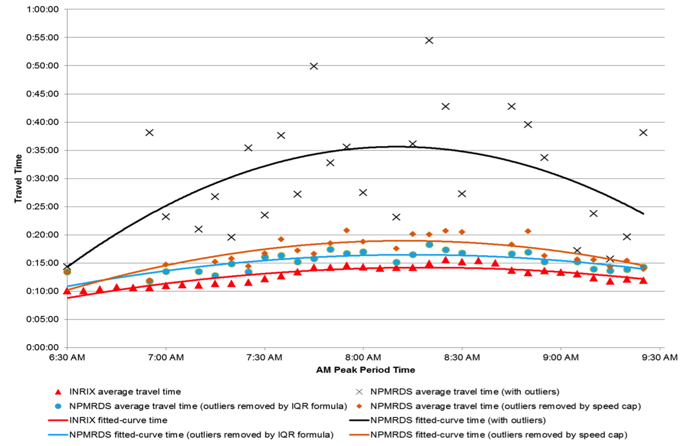 Comparison Between the Two Outlier Removal Methods for the NPMRDS All-Vehicle Dataset Five-Minute Increments Between 6:30 AM and 9:30 AM