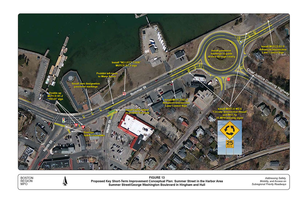 11 The retrofit would be accomplished through pavement markings under the existing rotary layout in order to save the high cost of reconstruction. The width of the traffic island on the Chief Justice Cushing Highway approach would need to be reduced slightly in order to allow two circulating lanes.