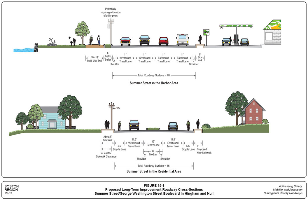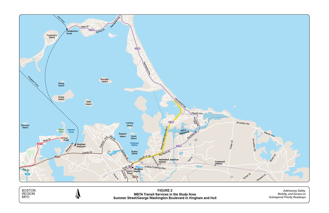 The roadway corridor of Summer Street, Rockland Street, and George Washington Boulevard in Hingham and Hull was selected for analysis in a Boston Region Metropolitan Planning Organization (MPO) funded project for federal fiscal year (FFY) 2015: “Addressing Safety, Mobility, and Access on Subregional Priority Roadways.” The work program for this corridor was approved on October 16, 2014, and the selection was approved on April 2, 2015.