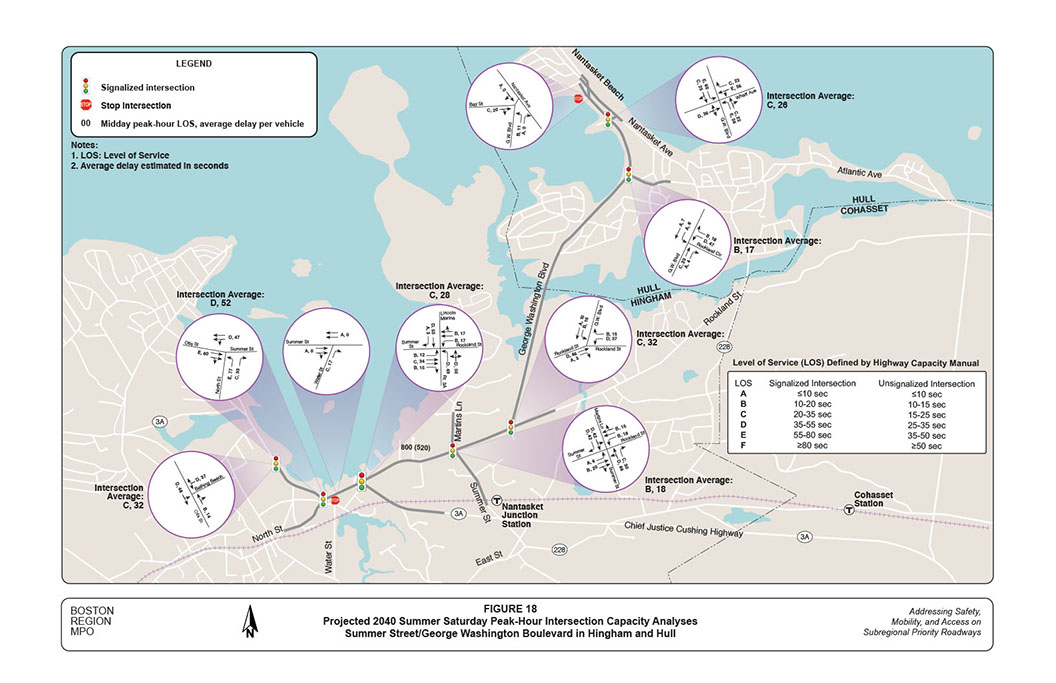 The three intersections in Hingham Harbor carried between 3,000-to-3,200 vehicles per peak hour each. The two intersections in the Hingham residential area carried approximately 2,300-to-2,400 vehicles per peak hour each. The two intersections on George Washington Boulevard leading to Nantasket Beach carried approximately 2,000-to-2,100 vehicles per peak hour each.