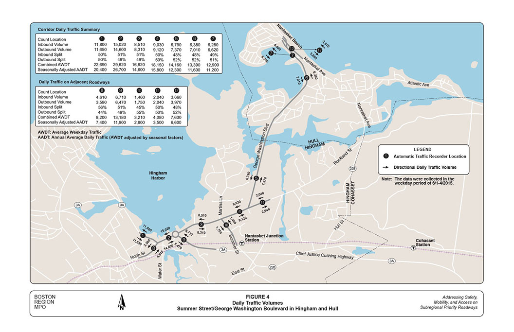 In general, the June counts show that traffic in the corridor is split evenly, by approximately 50 percent in each direction. Total traffic volumes vary significantly among different locations in the corridor, ranging from approximately 13,000 vehicles per day (near Nantasket Avenue) to nearly 30,000 vehicles per day (west of Route 3A Rotary).