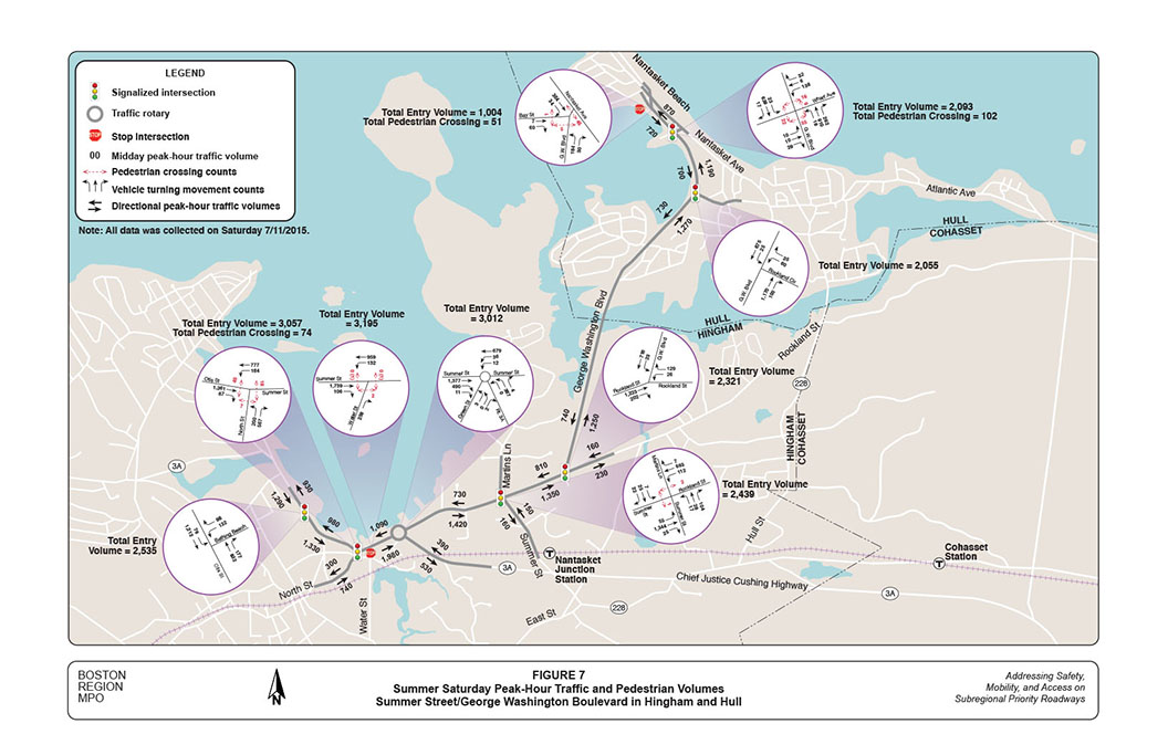 Figure 6 shows the weekday peak-hour traffic and pedestrian volumes at major intersections in the corridor. Entry volumes at these intersections vary from 1,000 vehicles per hour at the intersection of George Washington Boulevard at Wharf Avenue to 2,600 vehicles per hour at Route 3A Rotary, and generally are somewhat higher in the evening than in the morning.