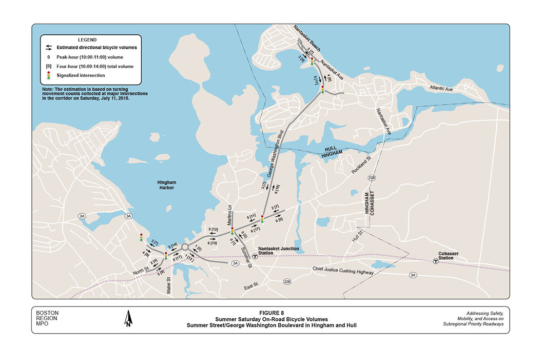 Similar to the weekday counts, the Saturday counts show that the corridor carries evenly split traffic on summer weekend days. Total traffic volumes vary among different locations, ranging from almost 22,000 vehicles per day on George Washington Boulevard near Nantasket Beach to 38,000 vehicles on Summer Street in the Hingham Harbor area. This accounts for an approximate 45-to-85 percent increase from the normal weekday traffic, mainly because of the traffic in and around Nantasket Beach in Hull.