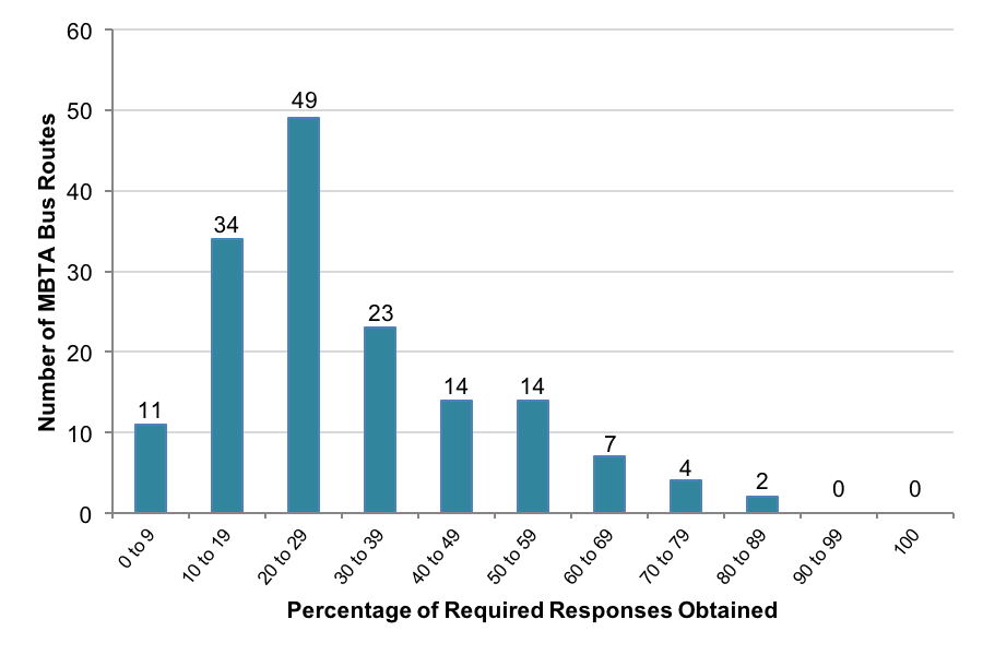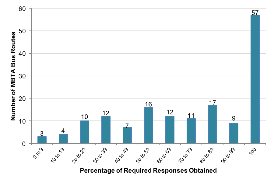 In addition, it is extremely costly and difficult to obtain comprehensive and statistically significant ridership data at the route level. Figure 1 shows that for the MBTA 2008–09 Systemwide Passenger Survey, none of the 158 bus routes surveyed had enough survey responses to obtain 95 percent confidence at a 5 percent confidence interval (assuming that all of the questions had been answered on each returned survey). Figure 2 shows that only 57 routes had enough responses when the confidence interval was increased to 10 percent.