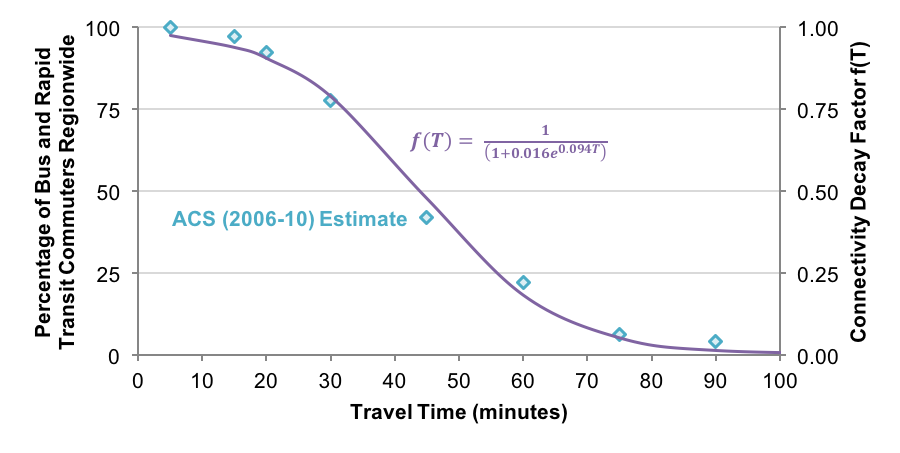 The second step for calculating the temporal comparability component of the MTOI involves using the total travel time from origin to destination from Table 13 and the connectivity decay function and its parameters estimated in Figure 4. The final calculation for the temporal comparability component is provided in Table 14.