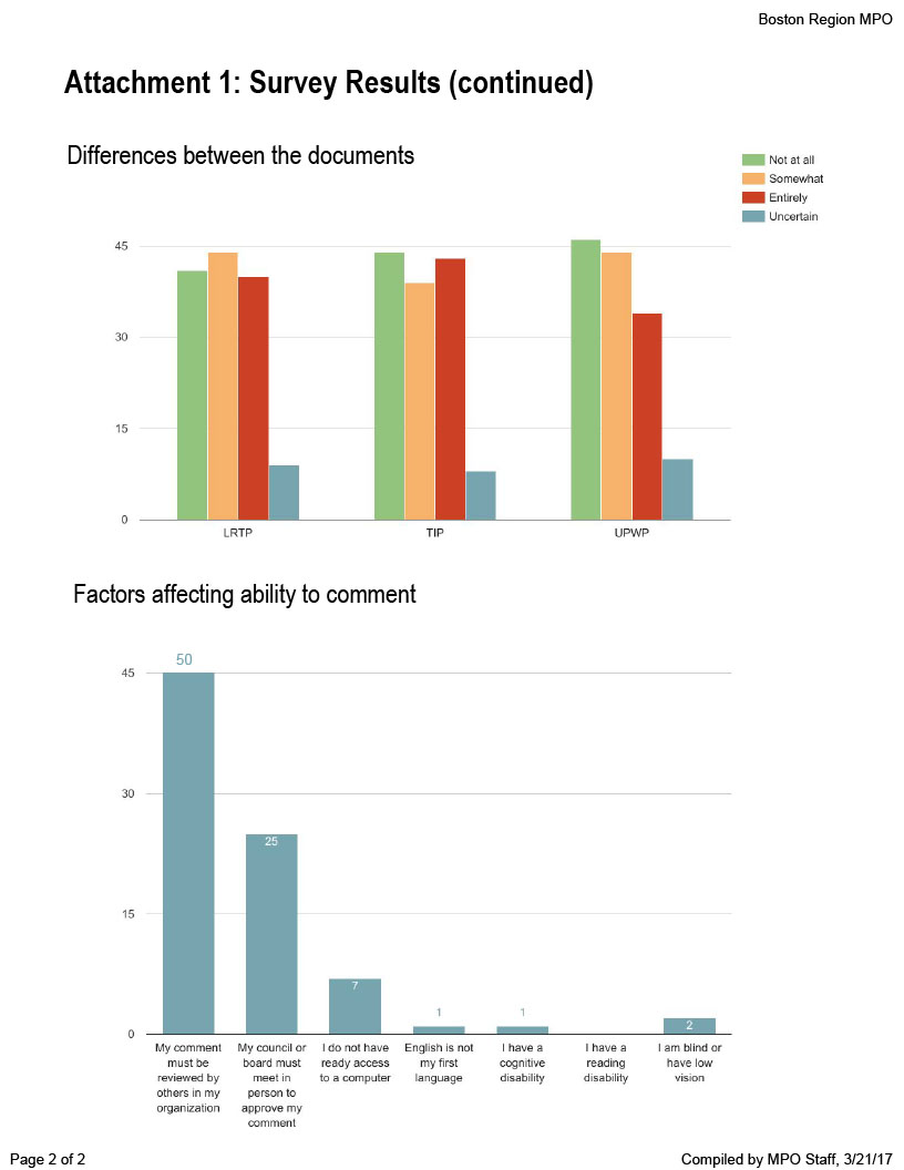 MPO staff notified the public of the review and comment period through email, Twitter, and a notice banner on the MPO’s website homepage. Staff also made announcements at the February meetings of the Regional Transportation Advisory Council and the Access Advisory Committee to the MBTA.