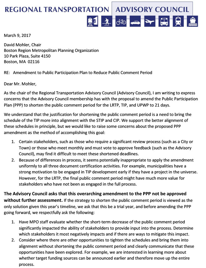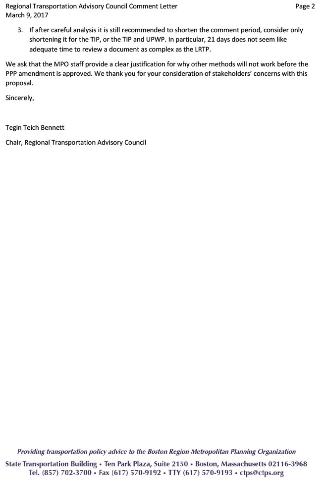 [See attached letter for full comments. Excerpt provided below.] As the chair of the Regional Transportation Advisory Council (Advisory Council), I am writing to express concerns that the Advisory Council membership has with the proposal to amend the Public Participation Plan (PPP) to shorten the public comment period for the LRTP, TIP, and UPWP to 21 days. We understand that the justification for shortening the public comment period is a need to bring the schedule of the TIP more into alignment with the STIP and CIP. We support the better alignment of these schedules in principle, but we would like to raise some concerns about the proposed PPP amendment as the method of accomplishing this goal: 1. Certain stakeholders, such as those who require a significant review process (such as a City or Town) or those who meet monthly and must vote to approve feedback (such as the Advisory Council), may find it difficult to meet these shortened deadlines. 2. Because of differences in process, it seems potentially inappropriate to apply the amendment uniformly to all three document certification activities. For example, municipalities have a strong motivation to be engaged in TIP development early if they have a project in the universe. However, for the LRTP, the final public comment period might have much more value for stakeholders who have not been as engaged in the full process. The Advisory Council asks that this overarching amendment to the PPP not be approved without further assessment. [...] We ask that the MPO staff provide a clear justification for why other methods will not work before the PPP amendment is approved. We thank you for your consideration of stakeholders’ concerns with this proposal. |