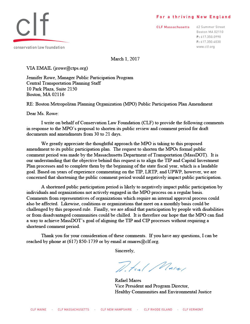 [See attached letter for full comments. Excerpt provided below.] Based on years of experience commenting on the TIP, LRTP, and UPWP, however, we are concerned that shortening the public comment period would negatively impact public participation. A shortened public participation period is likely to negatively impact public participation by individuals and organizations not actively engaged in the MPO process on a regular basis. Comments from representatives of organizations which require an internal approval process could also be affected. Likewise, coalitions or organizations that meet on a monthly basis could be challenged by this proposed rule. Finally, we are afraid that participation by people with disabilities or from disadvantaged communities could be chilled. It is therefore our hope that the MPO can find a way to achieve MassDOT’s goal of aligning the TIP and CIP processes without requiring a shortened comment period. |