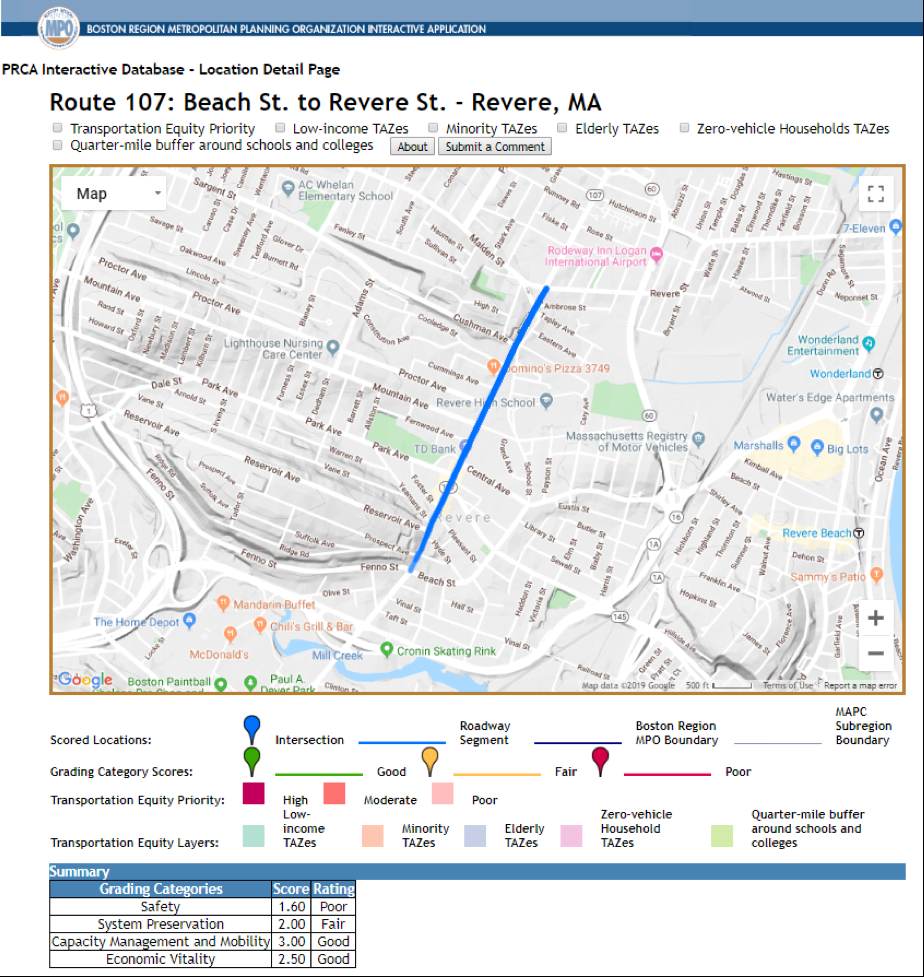 Users can click on the map icons for a specific PRCA or its unique identifier listed in the table to be taken to a page that includes detailed grading information for an intersection or roadway segment. Each page for a specific intersection or roadway segment PRCA features a map of the location above the information presented on the report cards. That information includes overall grades for the four grading categories, the transportation equity priority level (a location’s level of priority within the Boston region for safe and comfortable pedestrian travel), the unique grades assigned to the performance measures for each grading category, and the transportation equity factors present at the location. The top of the page illustrated in Figure 1 for the segment of Route 107 that runs from Beach Street to Revere Street in Revere is illustrated in Figure 2 below.
