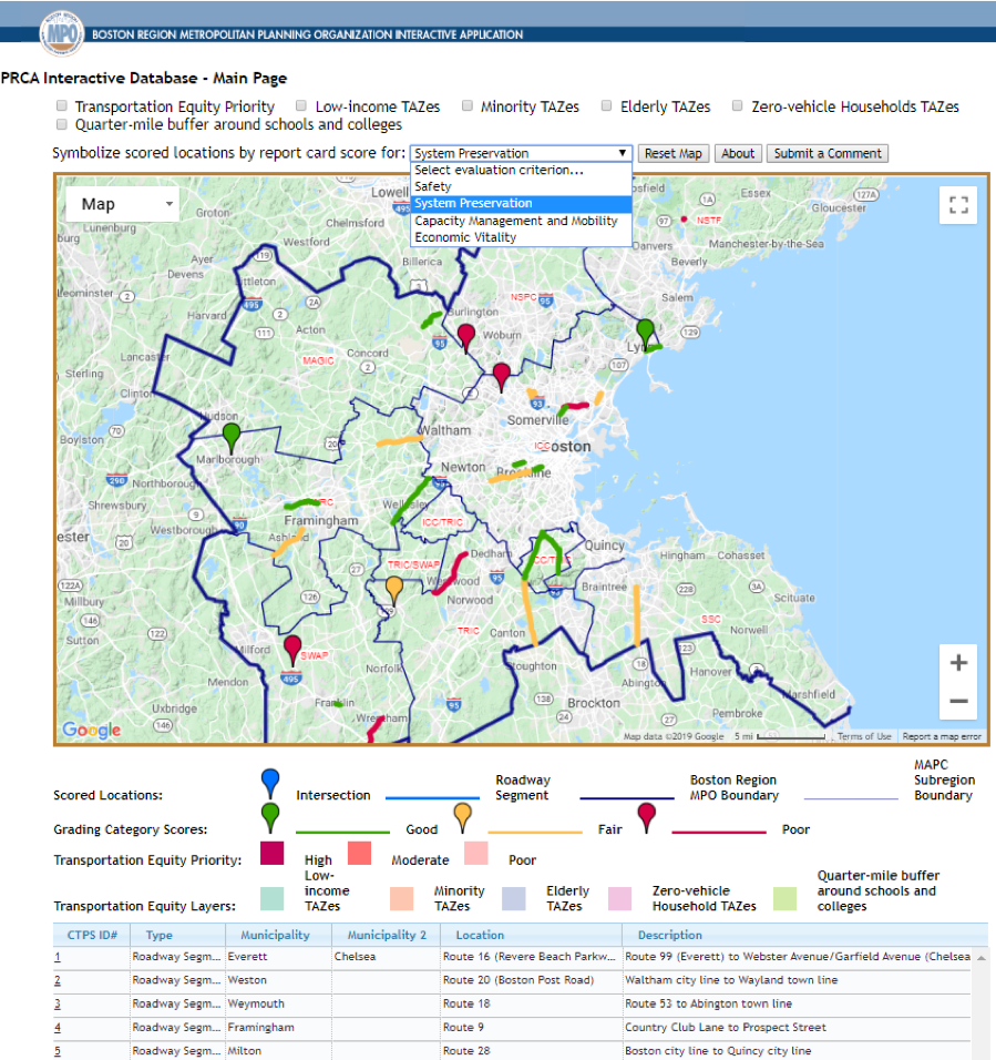 This information is displayed for the Boston region in the PRCA Interactive Database. Intersections are represented as points and roadway segments are shown as line work for the length of roadway studied. Figure 1 shows how basic identifying information about every graded location—such as whether it is a roadway segment or an intersection, the municipality where it is located, the name of the roadway or the intersecting streets, and a description of where a roadway segment begins and ends—is displayed in a table below the interactive map that includes every graded PRCA location in the Boston region.