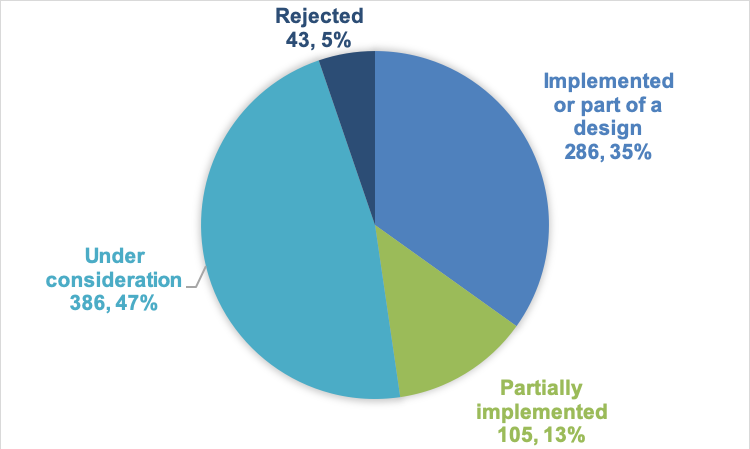 The UPWP Study Recommendation Tracking Database currently catalogues 1,860 recommendations made by MPO staff in studies and technical assistance projects between 2008 and 2018. The current implementation status of those recommendations is as follows: