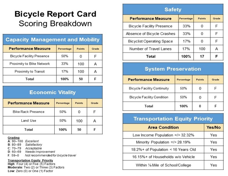 Without bicycle facilities at the location, it was impossible for either roadway to earn points for bicycle System Preservation, which led to another failing grade. Overall, the intersection was considered a High Priority area for pedestrian transportation equity because the proportions of all four populations at the location (low income, minority, youth, and zero-vehicle households) exceed the regional averages and the intersection was located within a quarter mile of a school.