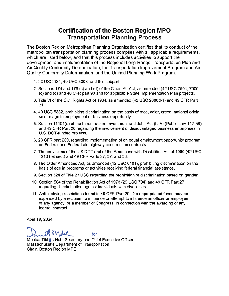 You are invited to participate in our transportation planning process, free from discrimination. The Boston Region Metropolitan Planning Organization (MPO) is committed to nondiscrimination in all activities and complies with Title VI of the Civil Rights Act of 1964, which prohibits discrimination on the basis of race, color, or national origin (including limited English proficiency). Related federal and state nondiscrimination laws prohibit discrimination on the basis of age, sex, disability, and additional protected characteristics.