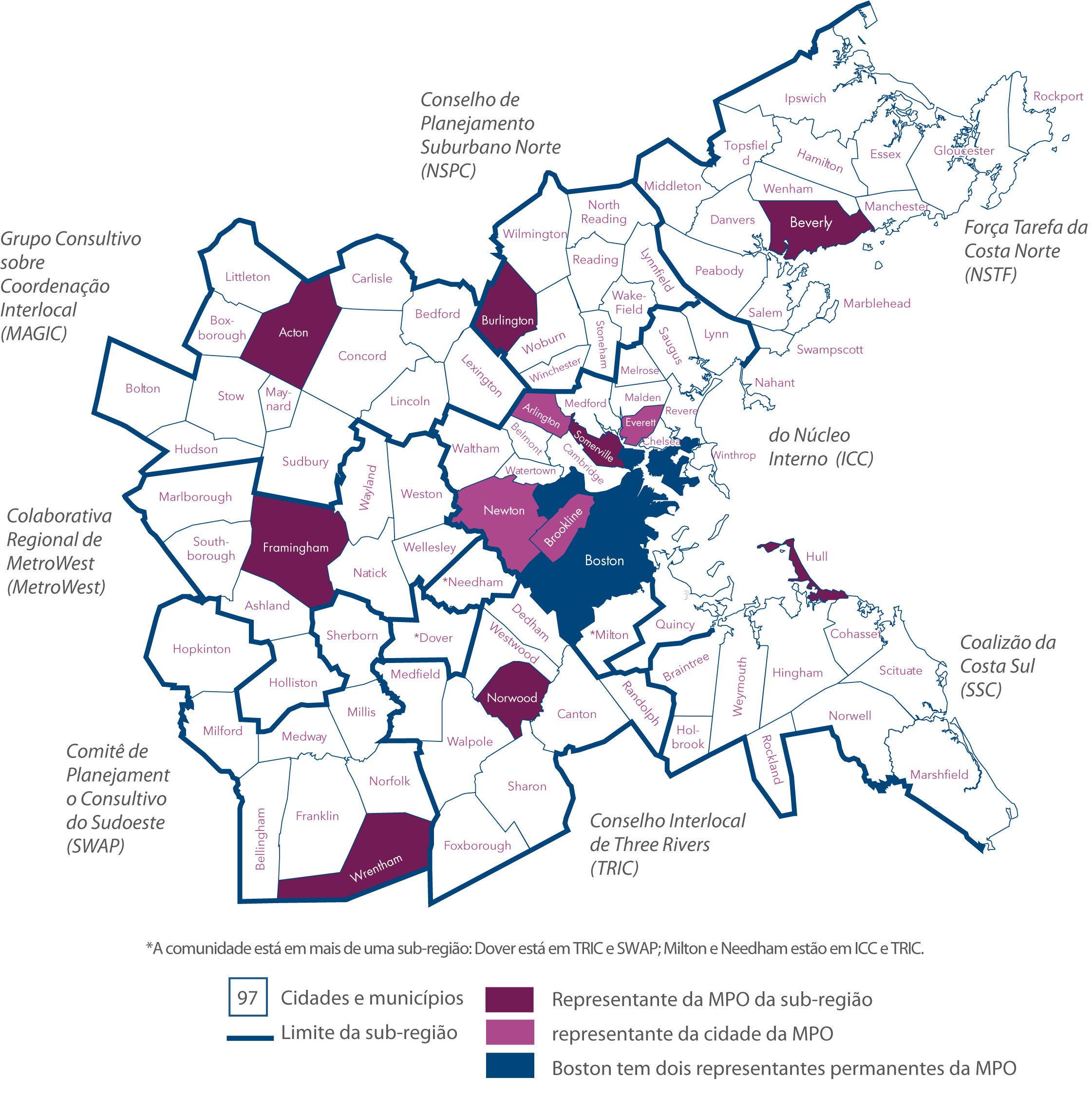 A área de planejamento da MPO da Região de Boston se estende por 97 cidades e municípios, desde o norte de Boston até Ipswich, ao sul até Marshfield e a oeste até a Interstate 495. A Figura ES-1 mostra o mapa dos municípios membros da MPO da Região de Boston.