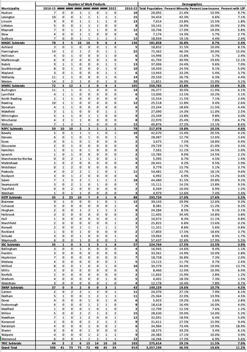 Each year, the MPO conducts a geographical assessment of the distribution of MPO-funded UPWP studies and technical support activities. Appendix G shows which communities in the region have been the subjects of MPO-funded studies or recipients of technical support from the MPO, as well as 3C-funded work completed by the Metropolitan Area Planning Council, for the FFYs 2010 through 2022 UPWPs. For each municipality, the table includes the population that is minority, low-income, or has limited English proficiency, as well as the number of UPWP tasks that have occurred in each FFY.