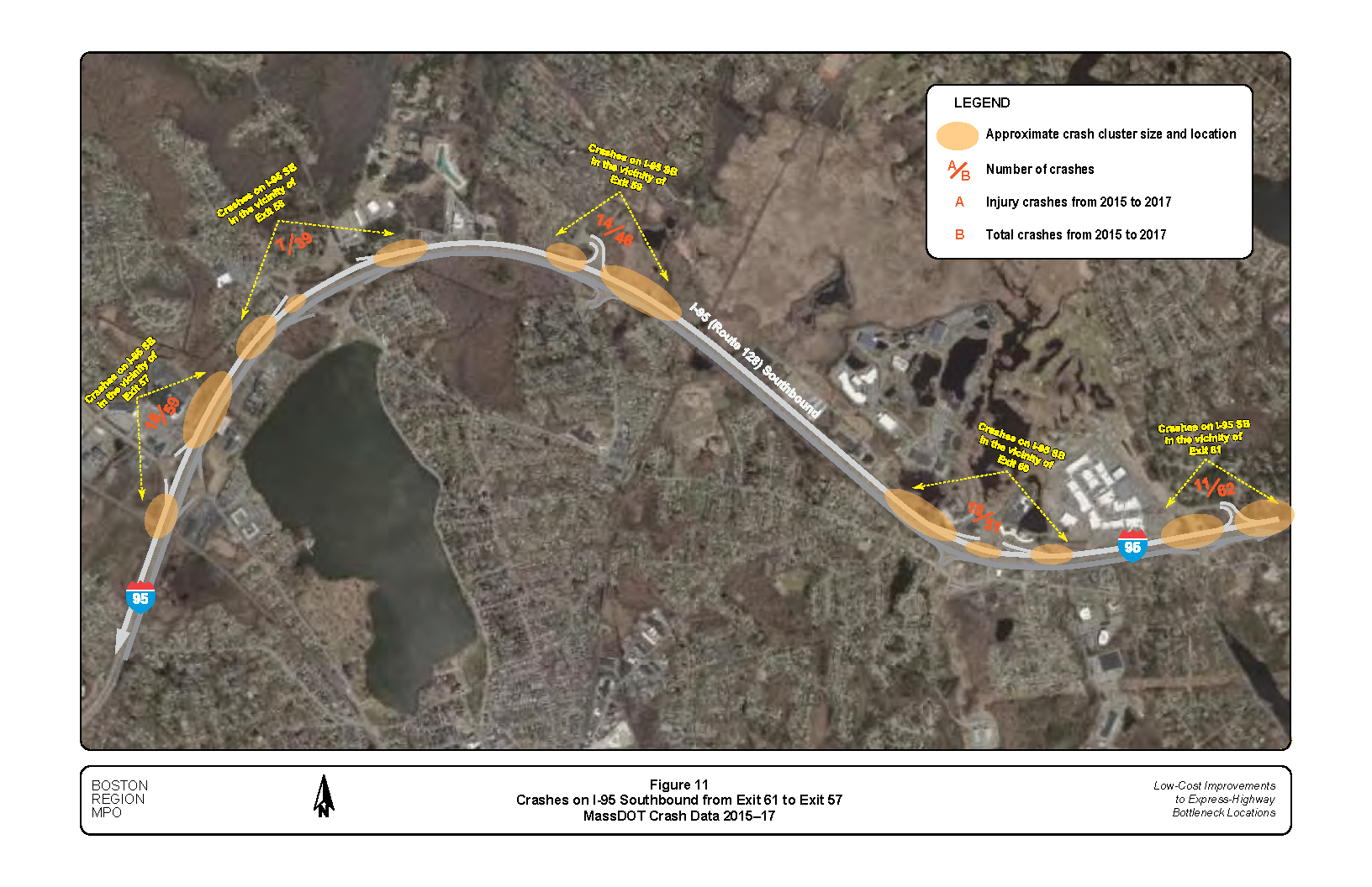After further review of the areas adjacent to the two locations and discussions with MassDOT Highway Division District 4 staff, MPO staff selected the northbound and southbound sections of I-95 between Exit 57 and Exit 61 for a comprehensive and systematic analysis to identify bottleneck locations for low-cost improvements. Travelers on this section of I-95 regularly experience poor levels of service and endure additional delays while entering or exiting the freeway during the weekday AM and PM peak travel periods.