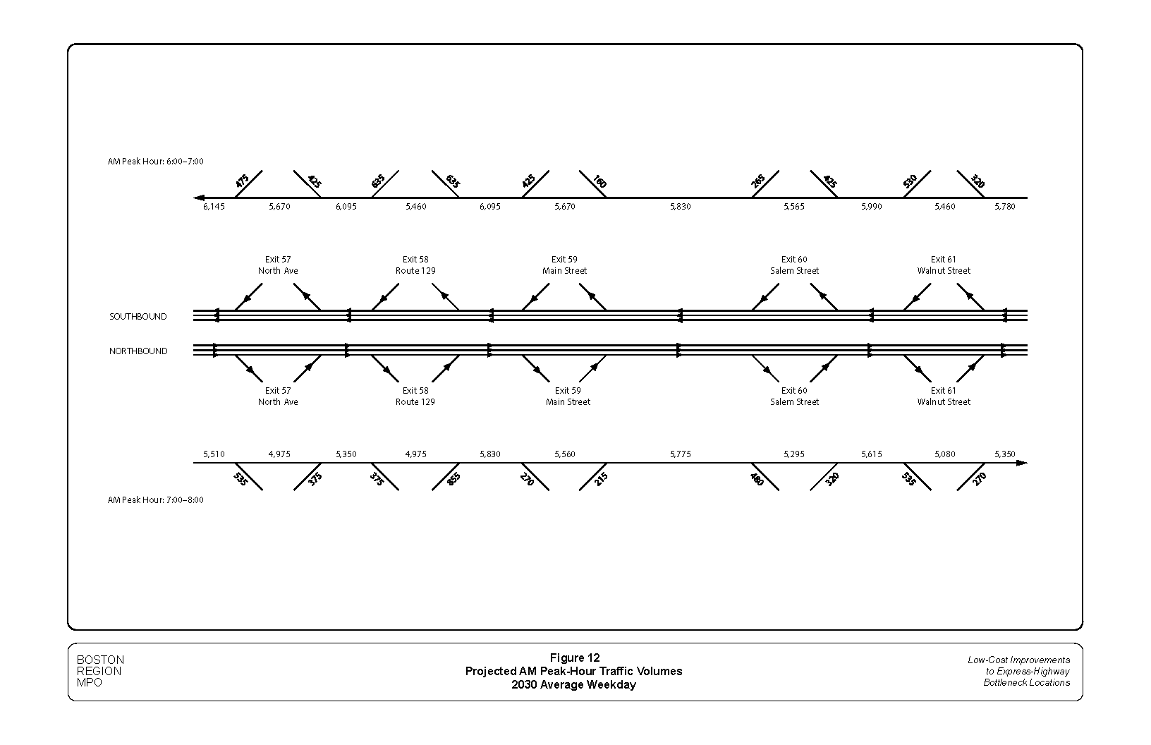 Staff chose 2030 as the future year and projected traffic volumes for the various freeway analysis segments by using growth factors estimated from the Boston Region MPO’s regional transportation planning model. The models projected that traffic in the study area would increase by seven percent (about 0.6 percent annually) on the northbound side and six percent (about 0.55 percent annually) on the southbound side in the AM peak hour, and by six percent on the northbound and seven percent on the southbound in the PM peak hour from 2019 to 2030. Figures 12 and 13 show the projected AM and PM peak hour traffic volumes at the different locations in the study area on an average weekday in 2030.