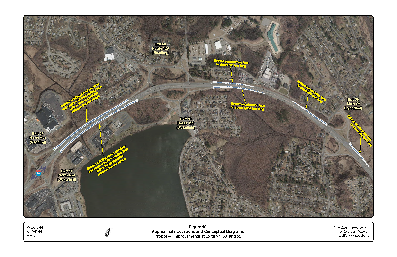 The section of Interstate 95 (I-95) between Exits 57 and 61 that runs through Reading, Wakefield, and Lynnfield, is one of the most frequently traveled corridors in the state. Motorists on this section of I-95 regularly experience delays resulting from highway bottlenecks, particularly during peak travel periods in the morning and afternoon. The federal fiscal year 2021 Low-Cost Improvements to Express-Highway Bottleneck Locations study examined these conditions to identify the cause of the traffic delays and develop low-cost solutions to improve traffic operations and safety in this area. Recommendations are given for reconfiguring acceleration and deceleration lanes and adding an auxiliary lane to alleviate congestion. The results of this study provide the MassDOT Highway Division with information for beginning to design and engineer improvements to these bottleneck locations.