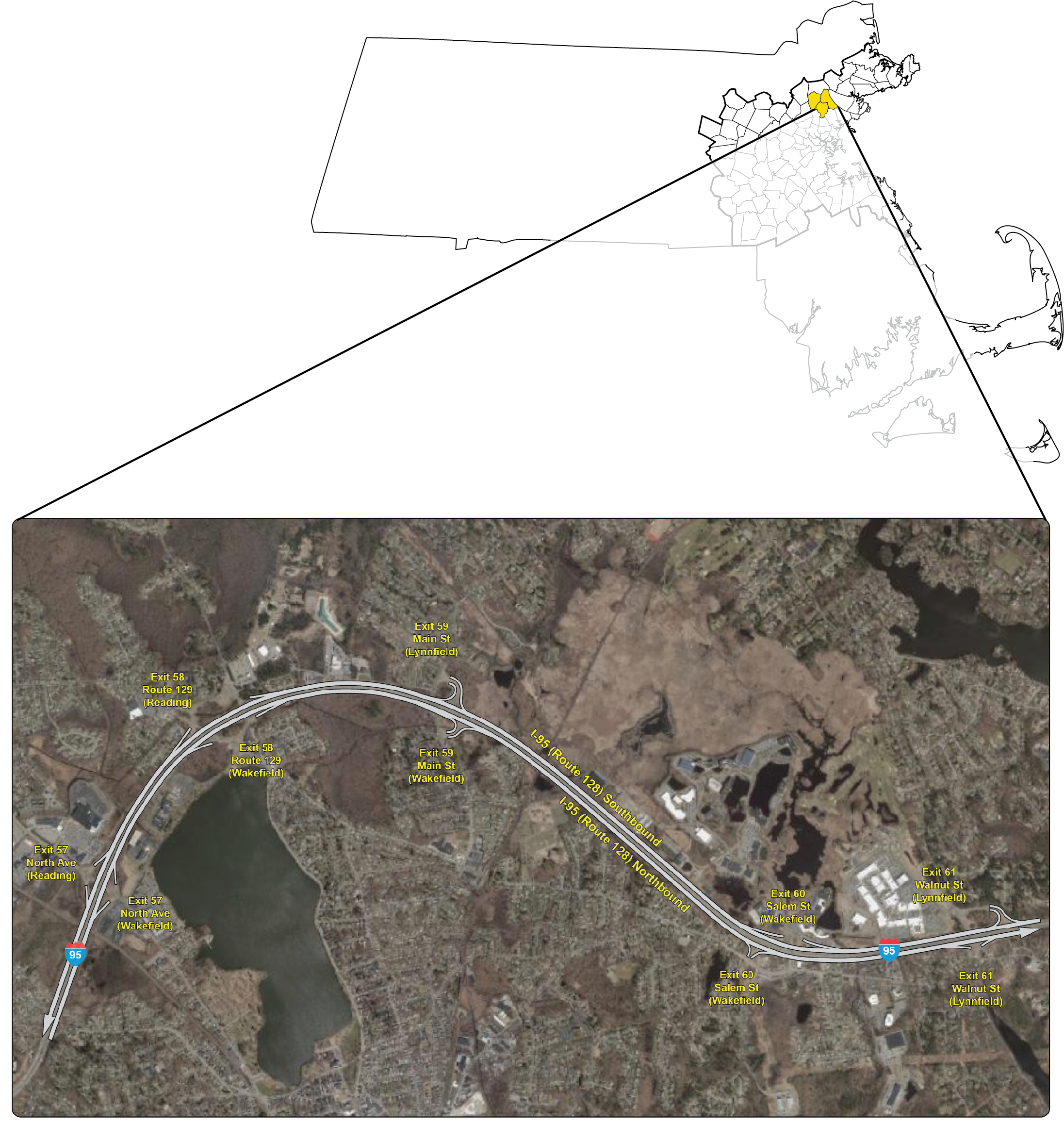 Bottlenecks on the freeway network can occur where geometric elements, such as ramps or lane drops, restrict traffic flow and become a major contributor to recurring congestion. Candidate locations in this study were identified based on input from the MassDOT Highway Division and review of the MPO’s Congestion Management Process data. The screening process yielded two locations on Interstate 95 (I-95) that had the potential for low-cost improvements: 1) I-95 southbound between Exit 58 (Route 129) and Exit 57 (North Avenue) in Wakefield and Reading, and 2) I-95 northbound at Exit 61 (Walnut Street) in Lynnfield.