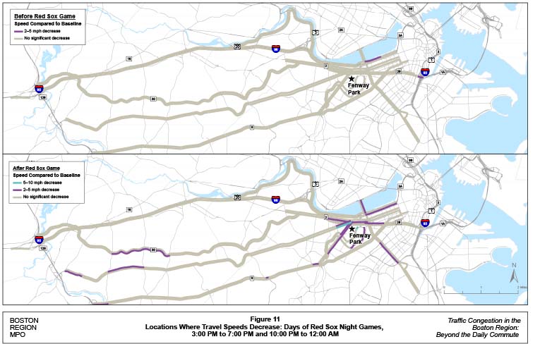 Nonrecurring congestion in the Boston region has a major effect on mobility in the region. Also, congestion may have an impact on the attendance at the events or lower the quality of life for people who have to endure congestion on certain days of the week, even if it is not during the peak period. Events that cause nonrecurring congestion are unique and each has a variable effect on congestion levels. The traffic on the day before Thanksgiving functions quite differently from traffic on the day of a parade, for example. Many roadways examined in this study have congestion during nonrecurring events that is worse than peak period congestion.