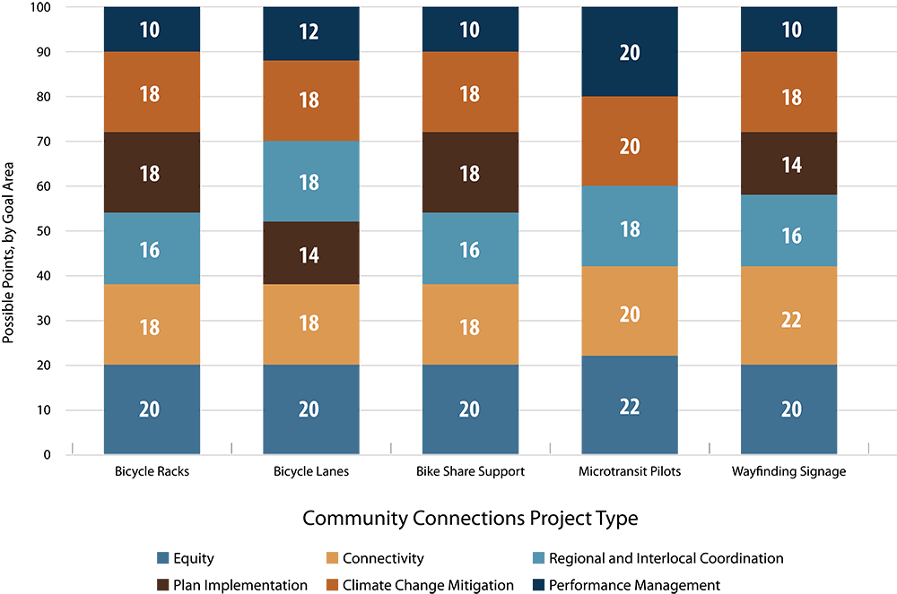 Projects in the Community Connections Program include those in the following subprograms: Bicycle Racks, Bicycle Lanes, Bikeshare Support, Microtransit Pilot, and Wayfinding Signage.