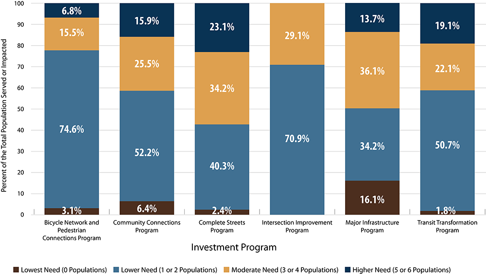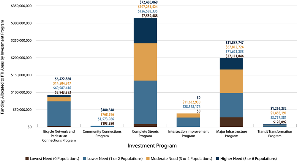Figure 6-3 shows the allocation of MPO funds within each investment program to projects that are expected to serve or impact these PTI tracts. The funding allocation is based on the percent of the population within each PTI category (see Table 6-2). The results show that allocation of funding to PTI tracts of higher need various across investment programs. PTI tracts of higher need take up the highest share of Complete Streets program funding, followed by the Transit Transformation Program. PTI tracts of lower need take up the highest share of Bicycle Network and Pedestrian Connections program funding, followed by the Intersection Improvements Program.